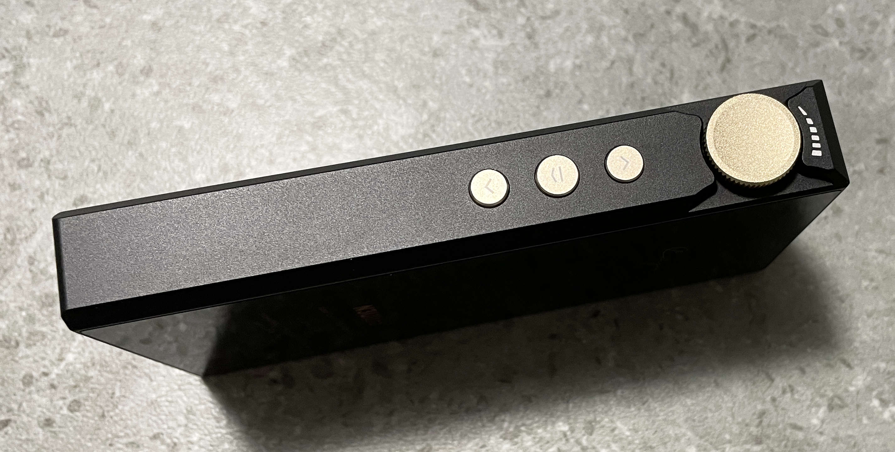 音量ノブと再生/停止ボタン、次の曲、前の曲操作ボタンがついている